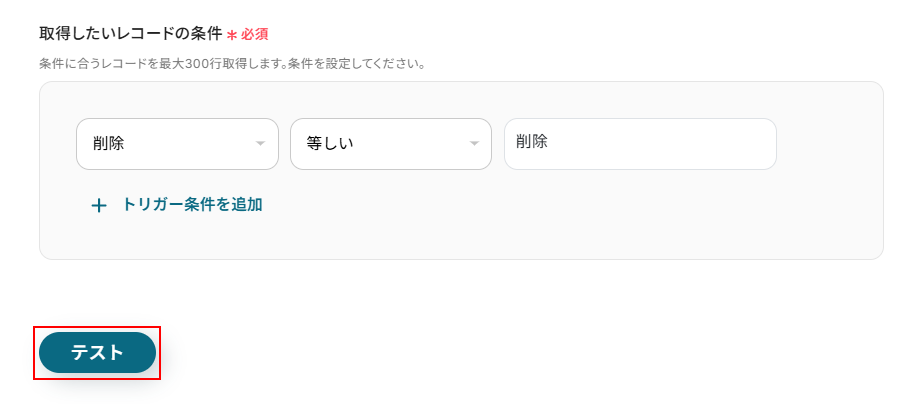 ご自身の状況に合わせて設定を行ってください。 今回は以下のように、スプレッドシートの削除項目に削除と入力されているレコードを取得できるように条件を設定しました。 設定できたらテスト をクリックしましょう。