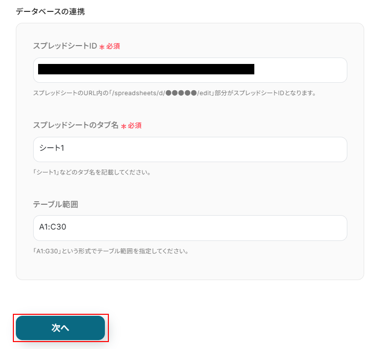 スプレッドシートID、スプレッドシートのタブ名、テーブル範囲はステップ4と同じもの を設定します。 設定できたら次へ をクリックしましょう。