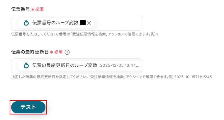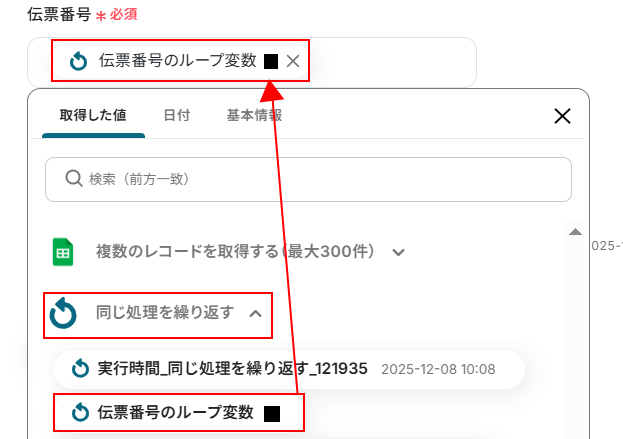 伝票番号、伝票の最終更新日にはデフォルトで取得した値が設定されていますので、〇〇のループ変数 となっている取得した値が設定されているか、項目名と値が表示されているかをご確認ください。 取得した値を活用することで、固定値ではなく、トリガーが実行されるたびに最新の情報が反映できます。 また、取得した値は以下のように入力欄をクリックすることで設定できます。