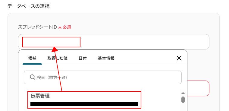 スプレッドシートIDを設定します。 入力欄をクリックし、表示された候補の中から使用するスプレッドシートを選択します。
