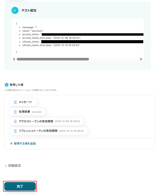 テストに成功するとテスト成功画面と取得した値が表示されますのでご確認ください。 確認できたら完了 をクリックしましょう。