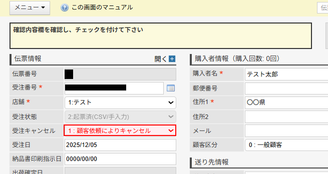 確認できたらテスト をクリックしましょう。 ※テストをクリックすると実際に伝票がキャンセルされます。