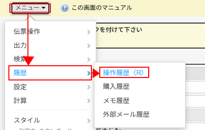 伝票の最終更新日は伝票の詳細画面左上にあるメニューから確認できます。 一番上に表示されている操作日時をコピーしてください。