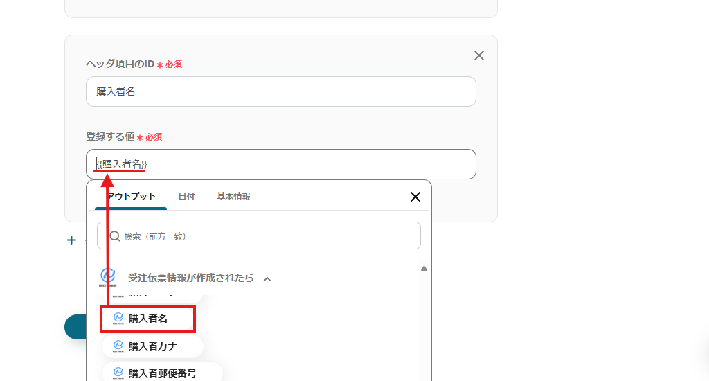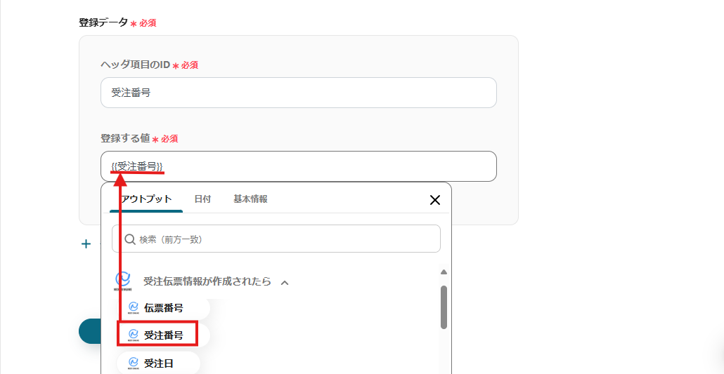 解説:このように設定することで、NEXT ENGINEに受注伝票が作成されたら、自動で「受注番号」を取得し、楽楽販売のレコードに登録できます。
