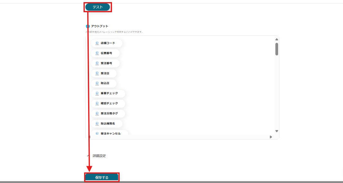 テストが成功すると、先ほどNEXT ENGINEで作成した受注伝票の情報がアウトプットに表示されます。