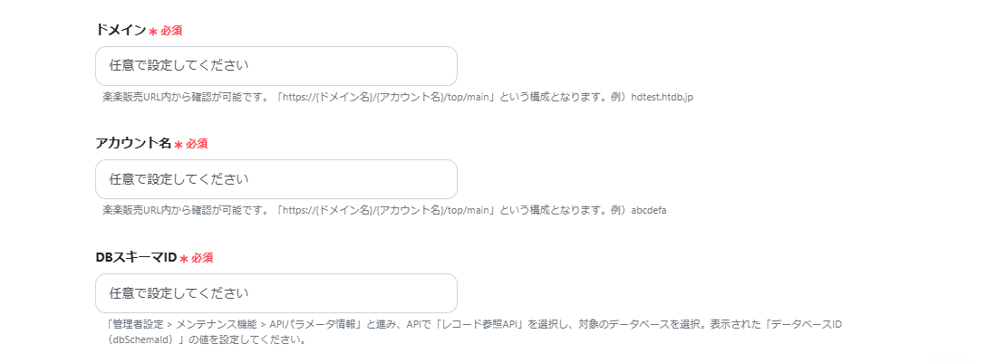 ドメイン、アカウント名、DBスキーマIDは枠外の注釈を参考に設定してください。