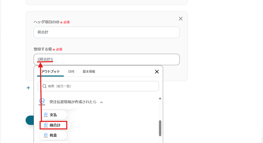 先ほど同様に、「購入者名」と「総合計」を自動取得できるように設定してみました。