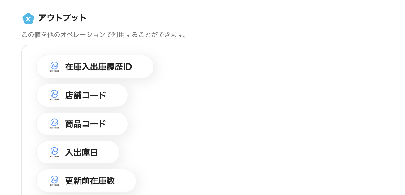 アウトプット情報は、「この値を他のオペレーションで利用することができます。」という注釈の通り、この後のステップで引用・活用できます。