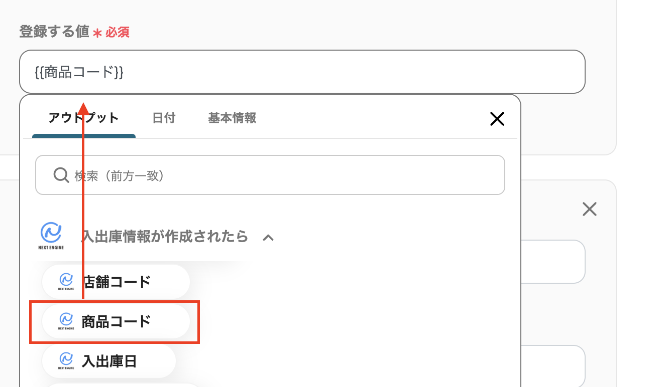 以下の画像は、「登録する値」に1つめのステップで取得した【商品コード】を引用したものです。