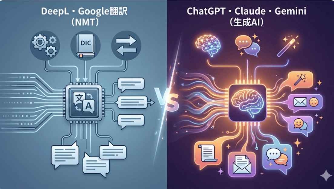 翻訳ツールを選ぶ際、まず理解しておきたいのが「従来のAI翻訳(NMT)」と「生成AI翻訳(LLM)」の違いです。