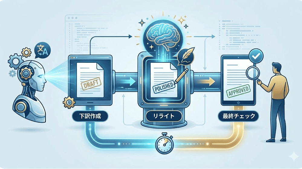 作成された下訳を生成AIに入力し、「不自然な言い回しの修正」や「トーンの統一」を行います。