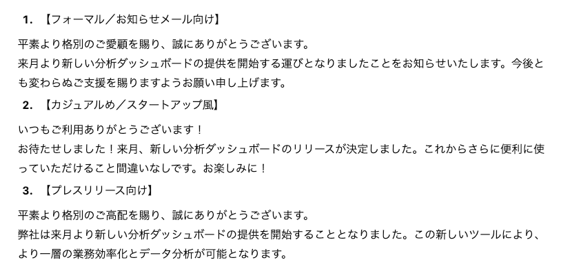 フォーマルな案内では格調高い敬語を使いこなし、スタートアップ風の指示では「!」を活用した親和性の高いトーンへ、プレスリリースでは公的な厳格さを備えた文章へと、TPOに合わせた最適化が瞬時に行われました。