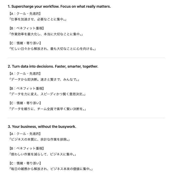 BtoB向けには「最大化」「意思決定」といった硬めの漢字を選んで信頼感を醸成し、個人向け(BtoC)には「解放」「心を向ける」といった平仮名混じりの柔らかな表現を使い分けるなど、解像度の高いアウトプットが確認できました。「データを力に変える」といった能動的な動詞の選択も記憶に残りやすいです。