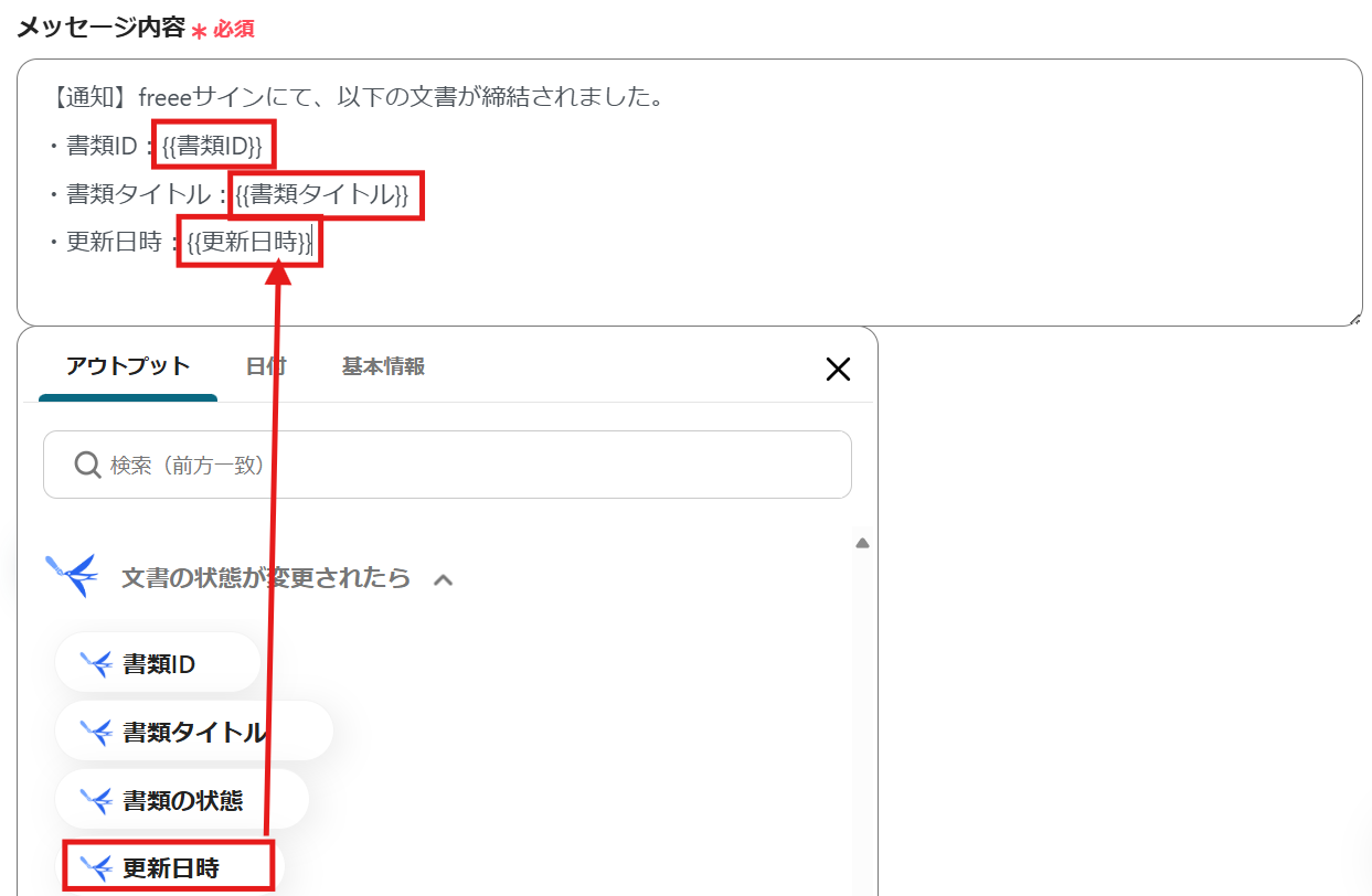 メッセージ内容は以下のように、アウトプットから選択しましょう。