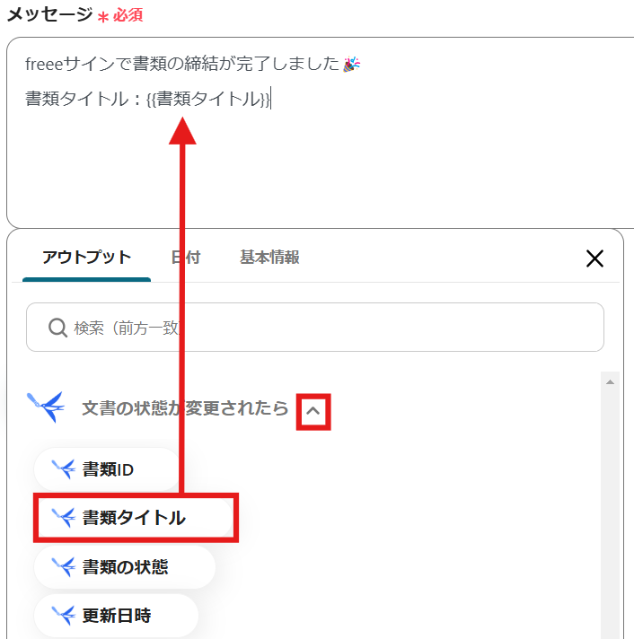 freeeサインのアウトプットを活用して、LINE WORKSで確認したい書類情報を設定します。