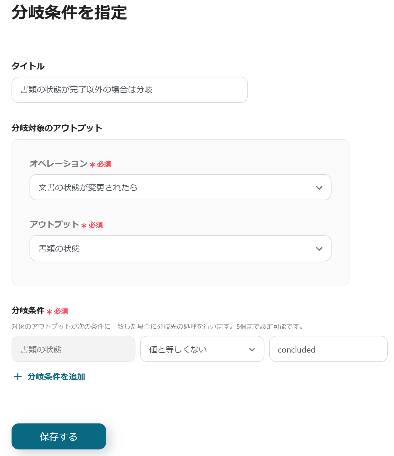 次に、書類の状態が「完了」以外の場合は分岐する設定を行うため、「書類の状態が完了以外の場合は分岐」をクリックしてください。