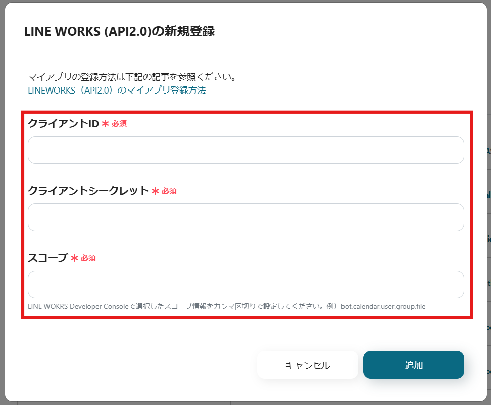 続いて、LINE WORKSのマイアプリ登録を行います。