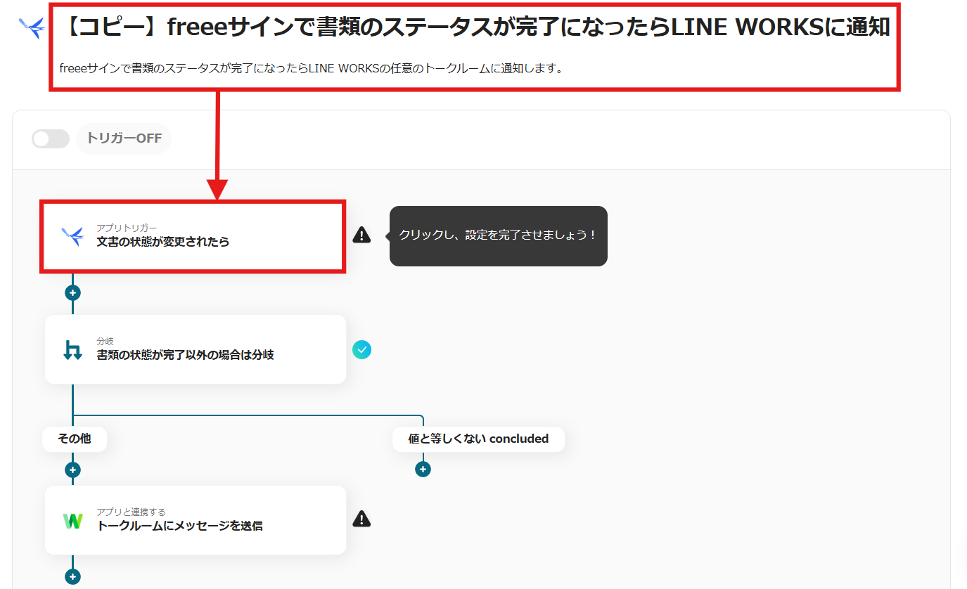 その作業を自動化に任せれば、「完了」になったタイミングでLINE WORKSに通知することができます。