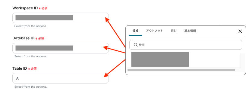 3.「Workspace ID」、「Database ID」、「Table ID」は、欄をクリックして表示される候補から該当項目を選択してください。