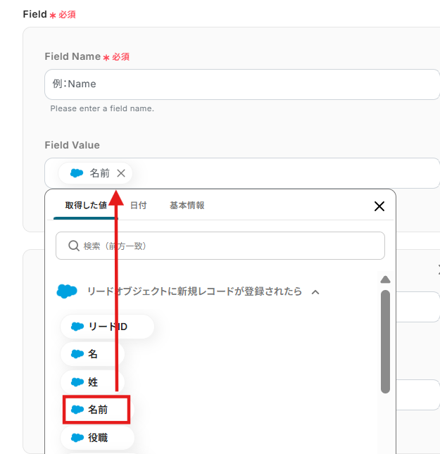 例えば、以下のように設定すると、Salesforceで登録した「名前」をNinox側にも自動で反映できるようになります。