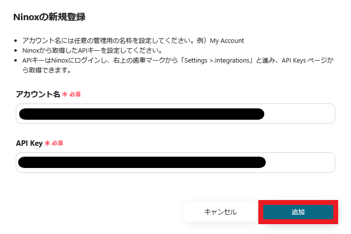 表示された画面で、注釈を参考に必須項目を入力し、「追加」をクリックしてください。