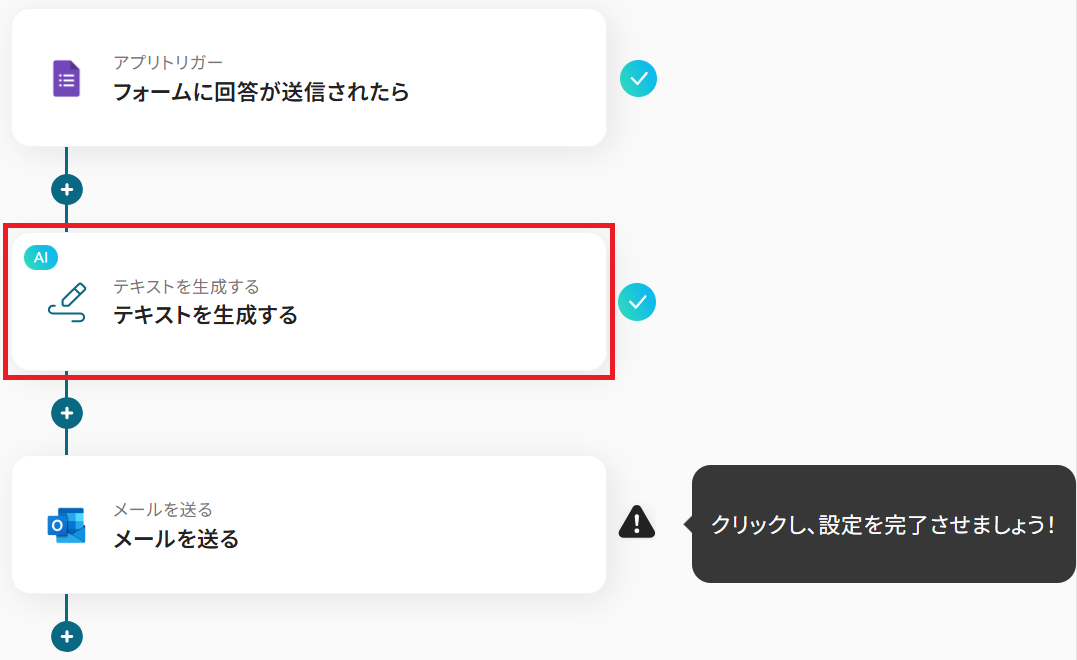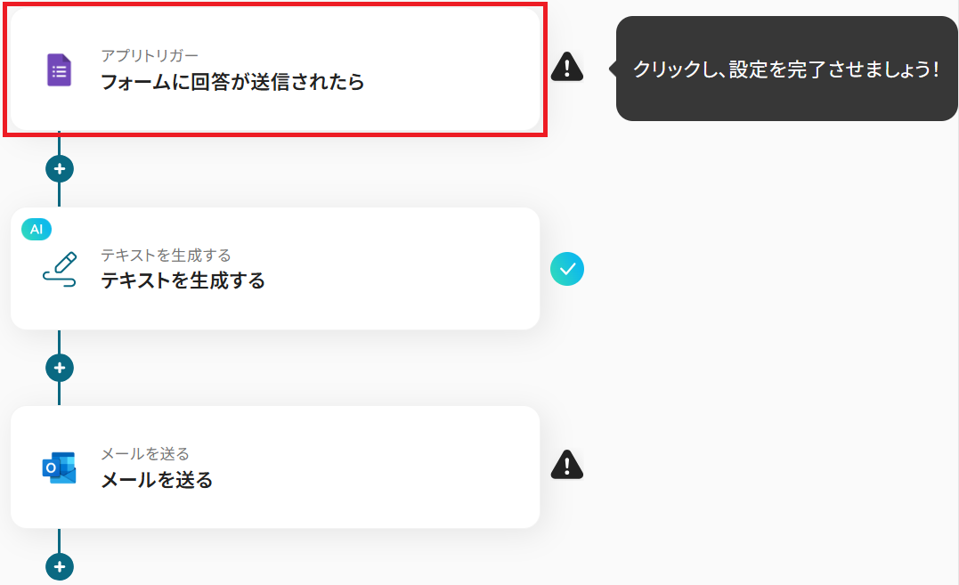 - Googleフォームのトリガー設定、AIのアクション設定、Outlookのアクション設定