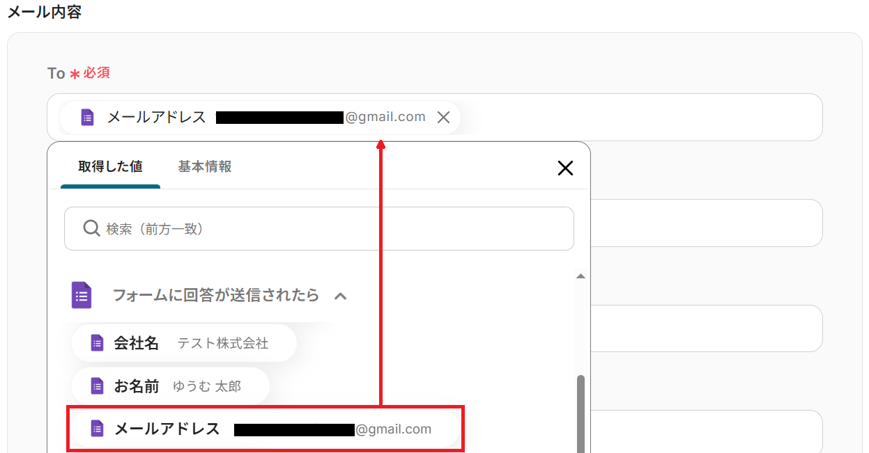 次に、Toの欄にステップ3で取得したアウトプットの「メールアドレス」を選択しましょう。