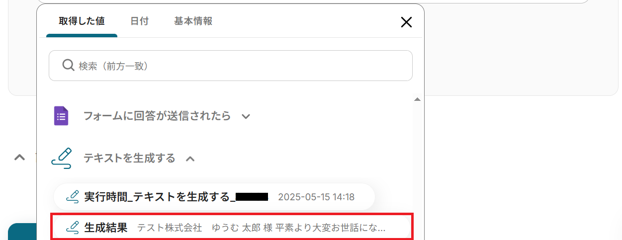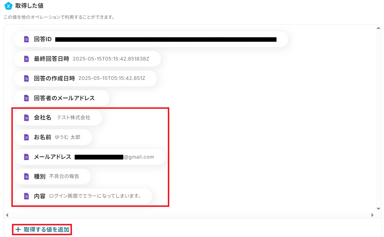 ・Googleフォームをトリガーとして使用した際の回答内容を取得する方法は下記を参照ください。