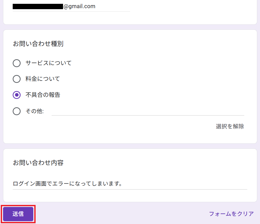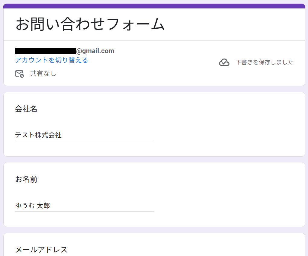 今回は以下のようなフォームを作り、テスト回答しました。
