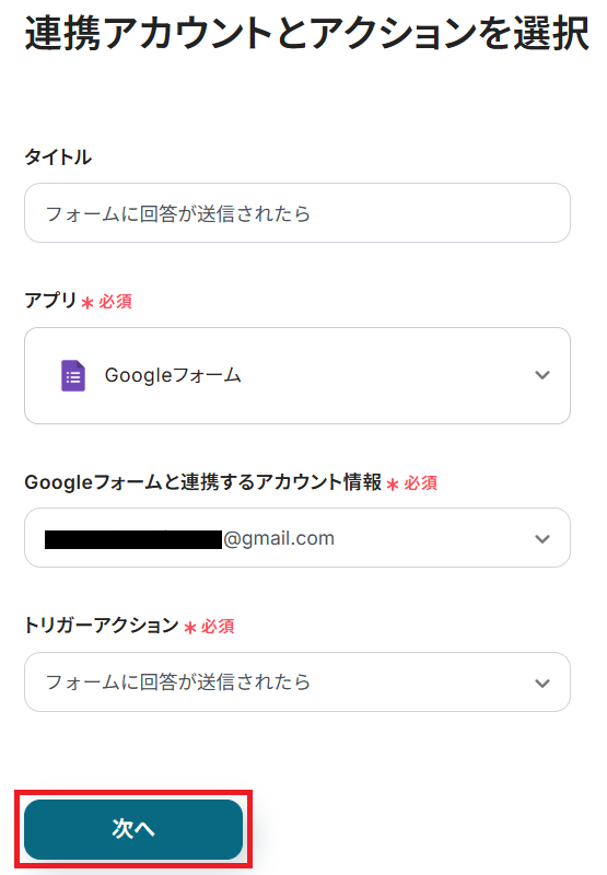 タイトルと連携するアカウント情報を任意で設定し、トリガーアクションはテンプレート通りに「フォームに回答が送信されたら」のまま「次へ」をクリックして進んでください。