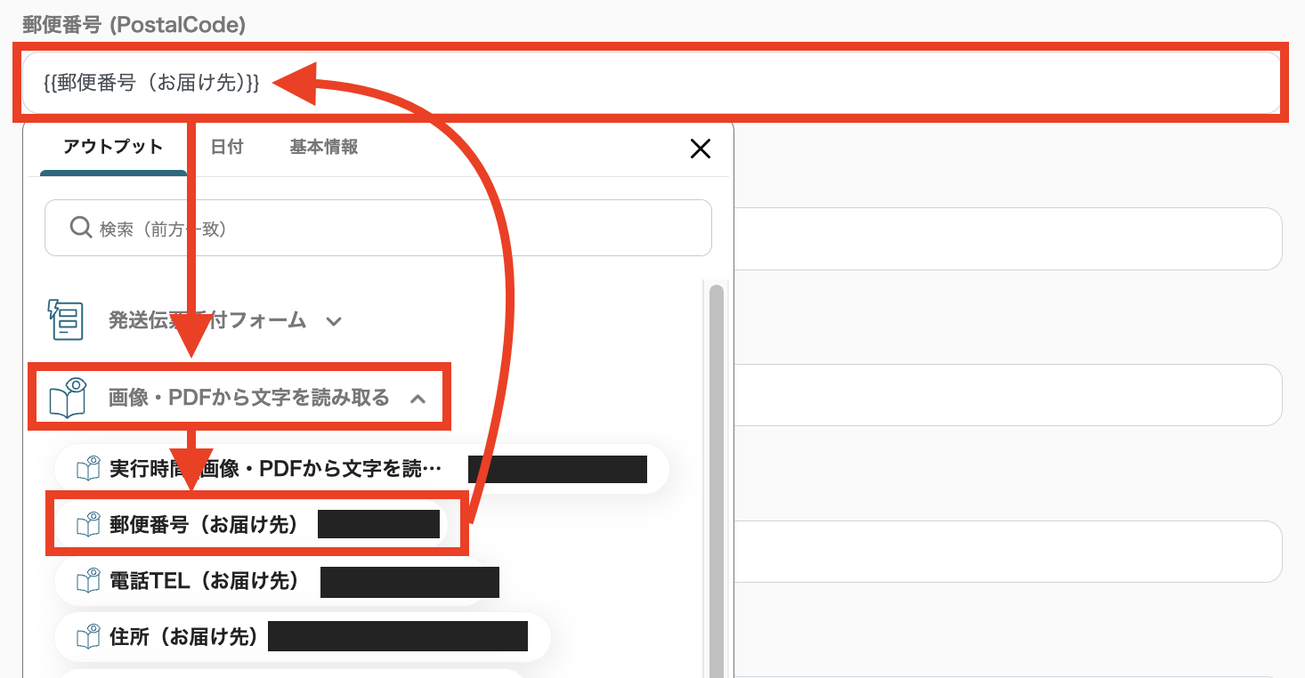 以下の画像のように、設定したい項目の欄をクリックし、「画像・PDFから文字を読み取る」のアウトプットの中から選択してください。