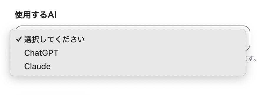 使用するAI:ChatGPTかClaudeから選択できます。