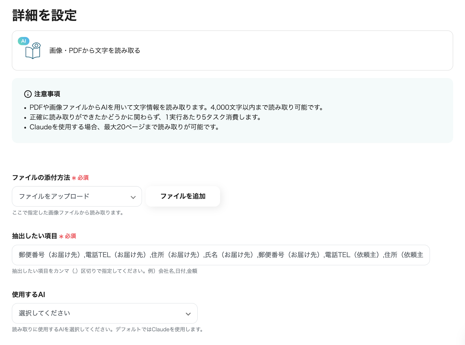 以下の「詳細を設定」ページで、ファイルの添付方法、抽出したい項目、使用するAIを設定してください。