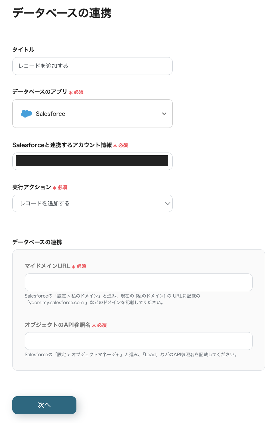 以下の「データベースの連携」ページで、連携アカウントを確認し、案内に従ってマイドメインURL、オブジェクトのAPI参照名を設定してください。