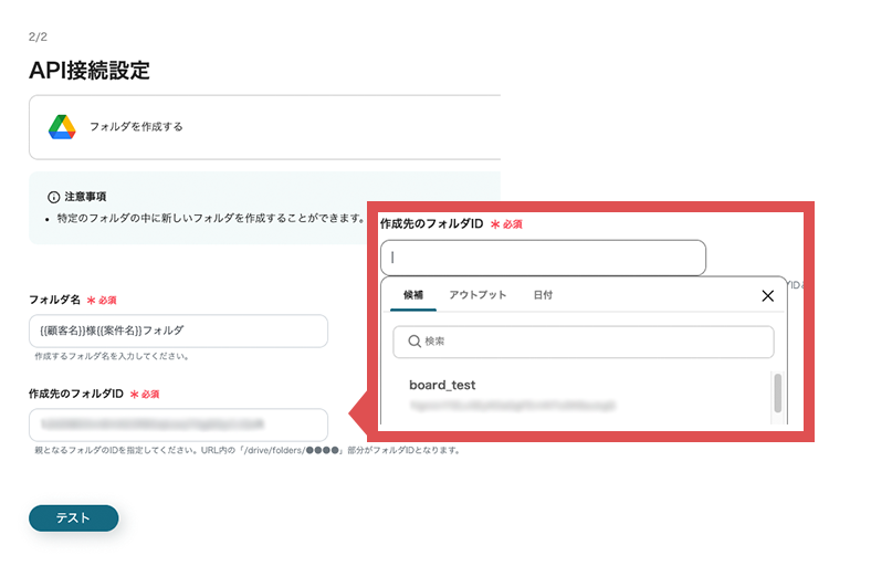 フォルダ名は先ほどのアウトプットから「顧客名」と「案件名」はフォルダ名として設定されています。 こちらは任意でカスタマイズすることが可能です。編集欄をクリックすると、先程のアウトプット項目が表示されます。その中から選択してください。 作成先のフォルダIDは候補から選択できます。 入力が終わったら「テスト」をクリックしましょう!