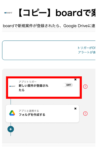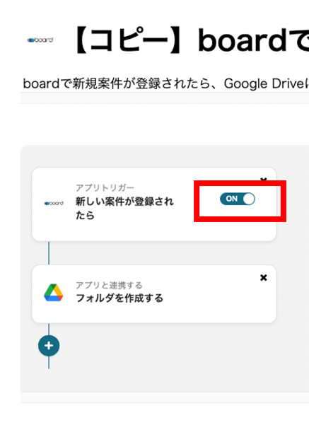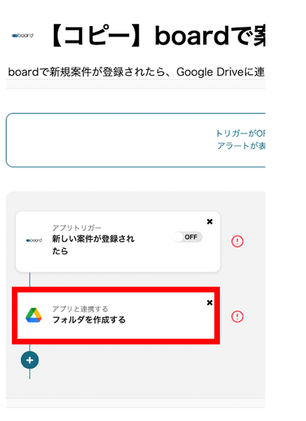 boardで新規案件が登録されたら、Google Driveに連携して案件名のフォルダを作成するフローです。