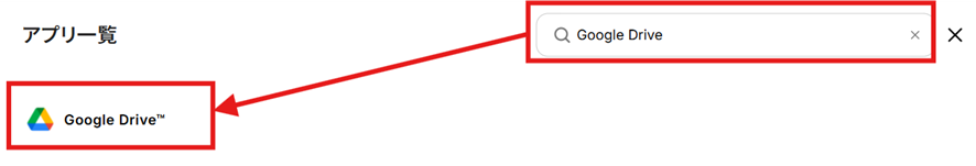 「新規接続」を選択すると「アプリ一覧」が表示されます。 Google Driveを検索して選択しましょう。
