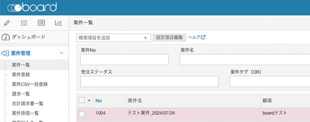 boardに下記の案件を登録してみました。 顧客:boardテスト 案件名:テスト案件_2024/07/26