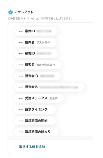 入力が終わったら「テスト」をクリックしましょう! 成功すると、アウトプットにboardの案件から抽出できる情報が項目ごとにあげられます。 入力が終わったら「保存する」をクリックします。