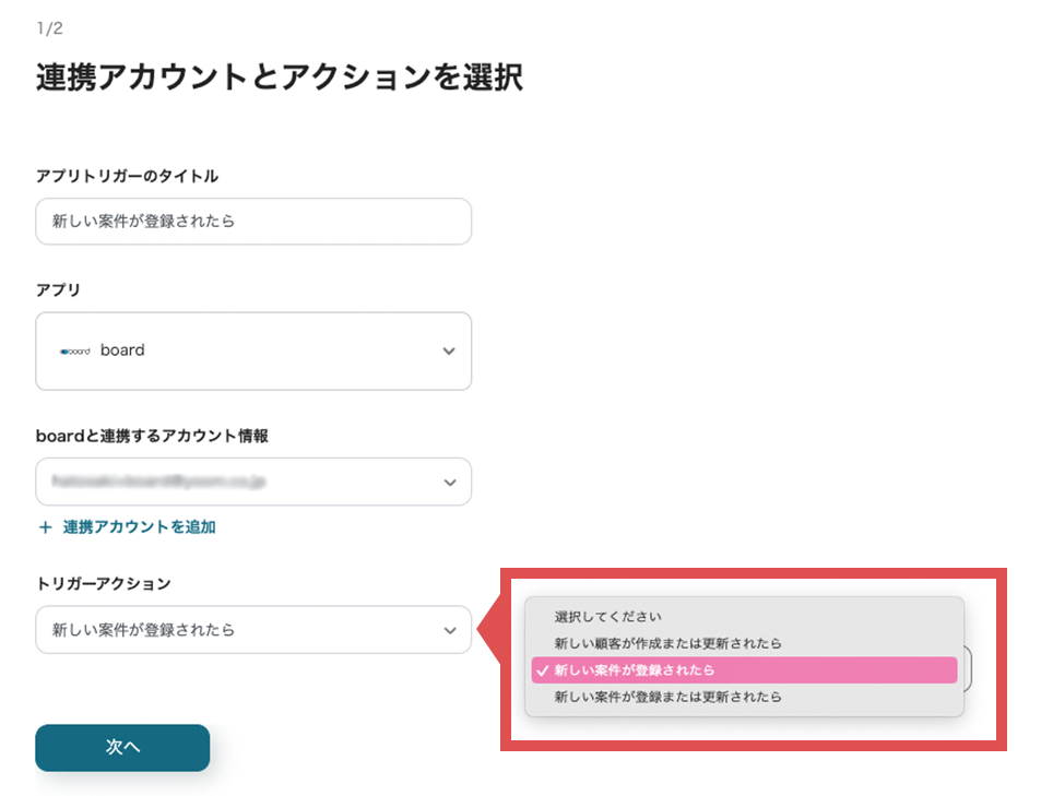 アプリトリガーのタイトル: 自由に入力可能アプリ: boardを選択boardと連携するアカウント情報: 「+連携アカウントの追加」をクリック トリガーアクション: 新しい案件が登録されたらを選択 入力が終わったら「次へ」をクリックします。