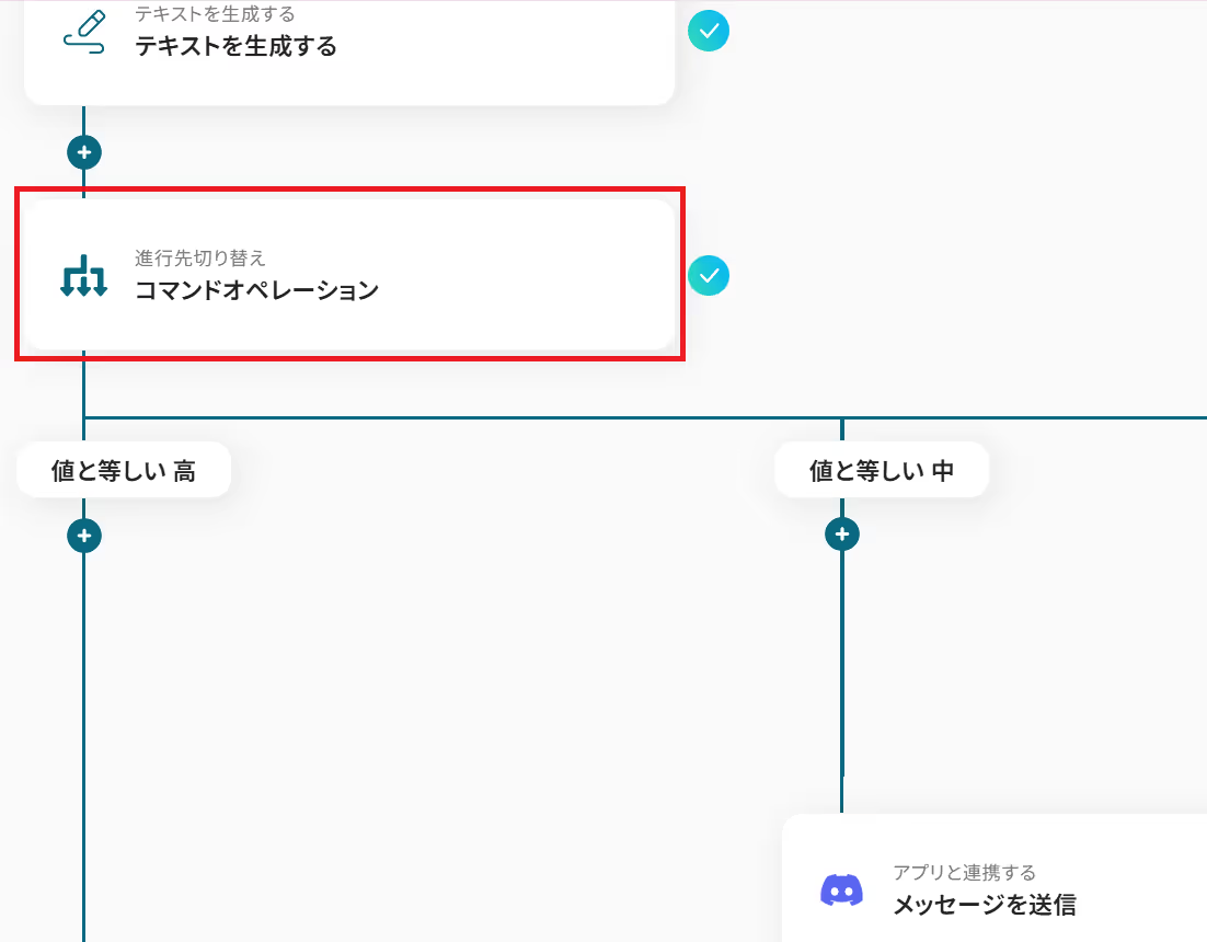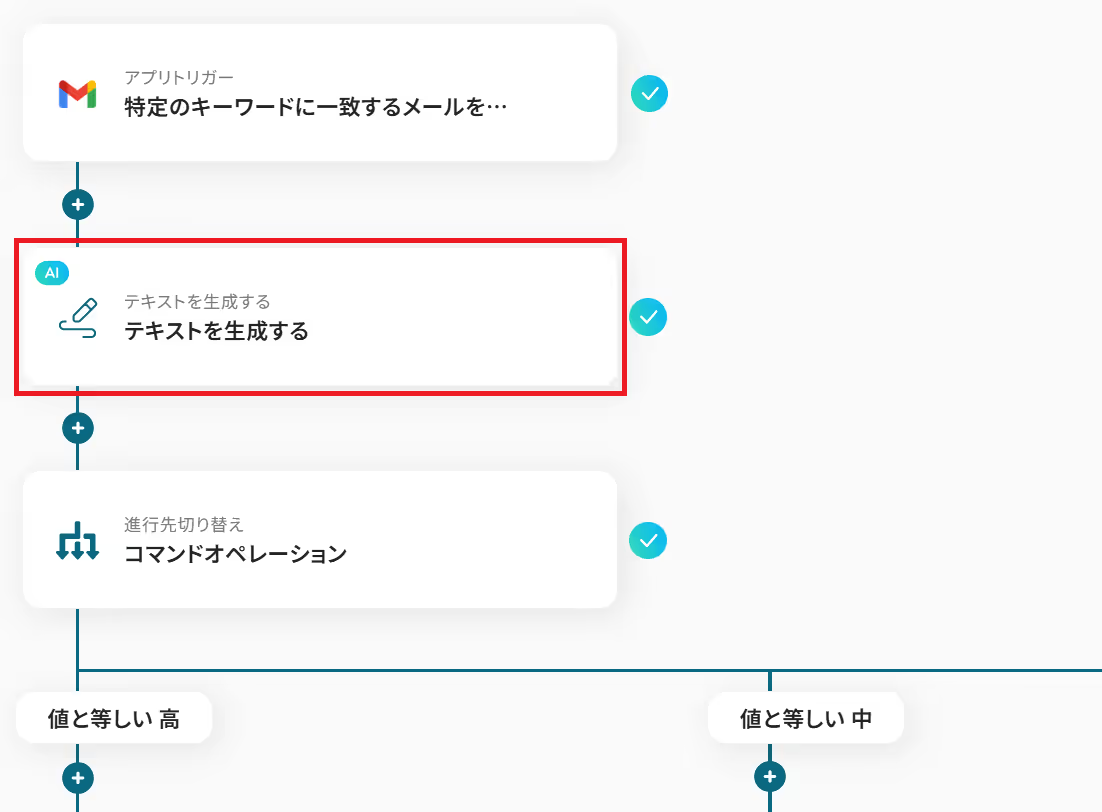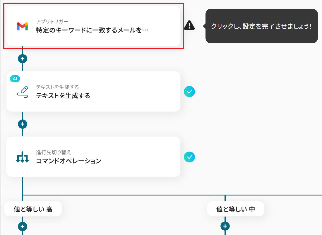 はじめに、GmailとDiscordをYoomと連携します。 次に、トリガーでGmailを選択し、「特定のキーワードに一致するメールを受信したら」というアクションを設定します。 オペレーションで、AI機能の「テキストを生成する」を設定し、受信したメールの本文や件名をもとに重要度を判定するよう指示します。 次に、進行先切り替え機能を設定し、AIが判定した重要度(高・中・低など)に応じて、その後の処理を分岐させます。 最後に、分岐先の各オペレーションでDiscordの「チャンネルにメッセージを送る」を設定し、判定結果に応じた内容を特定のチャンネルに通知します。 ※「トリガー」:フロー起動のきっかけとなるアクション、「オペレーション」:トリガー起動後、フロー内で処理を行うアクション