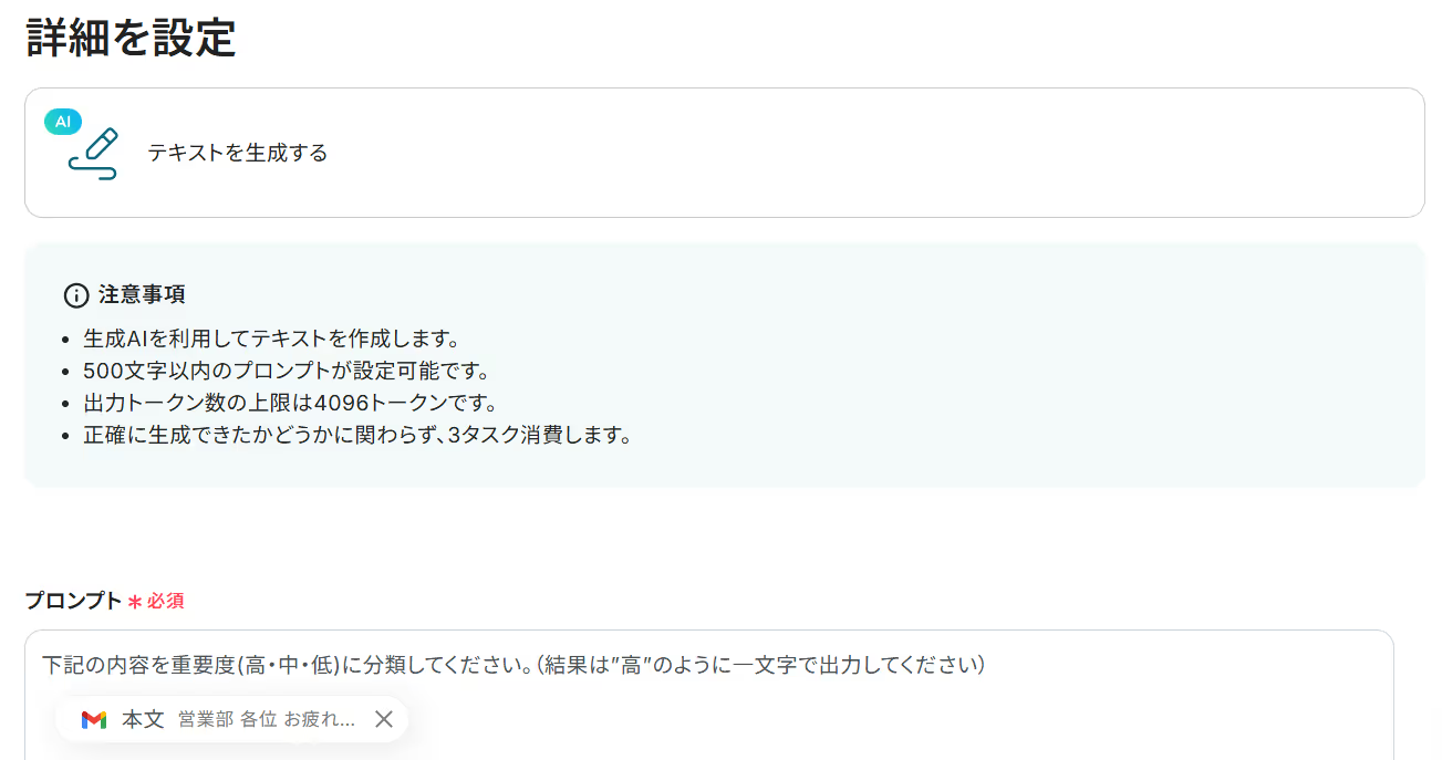 AI機能の「要約する」アクションでは、要約したいテキスト(メール本文や件名など)を任意で指定することが可能です。 X(Twitter)への投稿内容は、AIが生成した要約だけでなく、受信メールの件名や送信日時などの情報を変数として組み合わせ、自由にカスタマイズできます。 ■注意事項