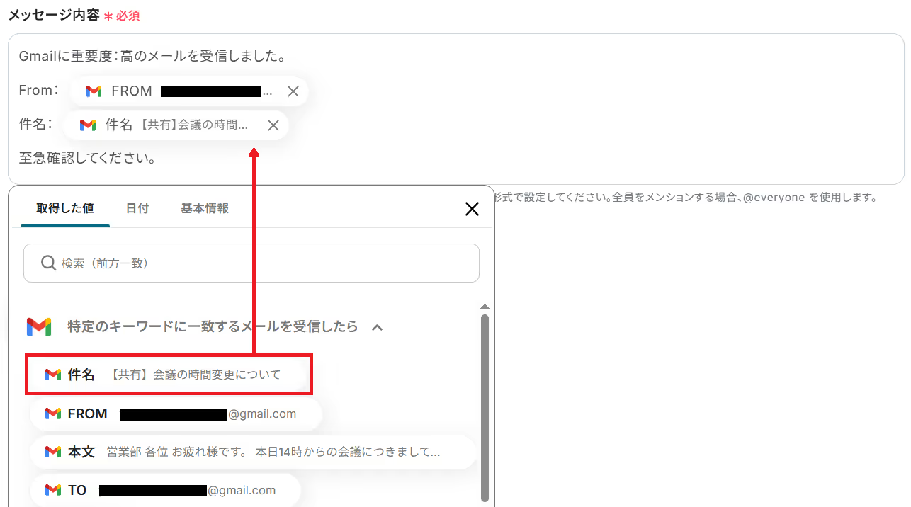 ・件名、本文:それぞれ入力します。②で取得した値を埋め込むことも可能です。
