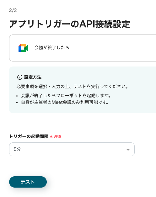 Google Meetの会議が直近1時間以内に行われていないと表示される場合があります。連携したアカウントをオーナーにした会議をテスト用に開き、再度テストを行ってください。