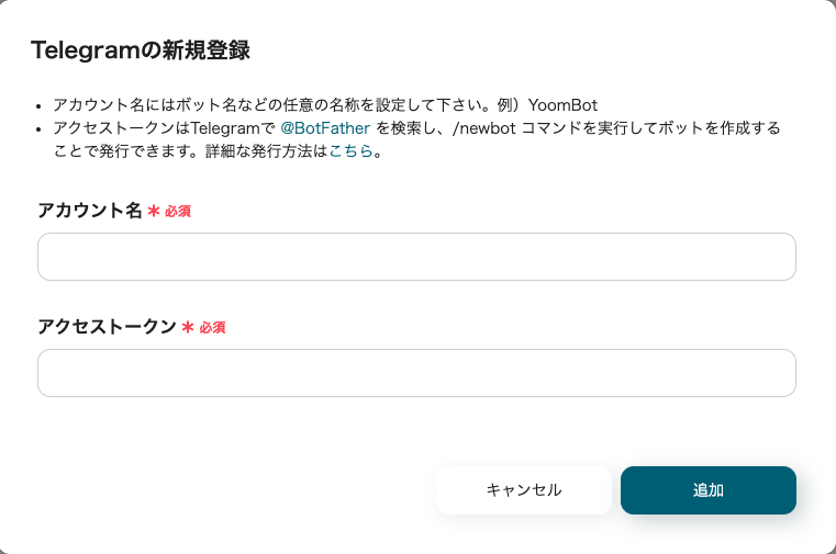 検索結果からTelegramを選択します。選択すると、下の画面が表示されアカウント名とアクセストークンが求められます。