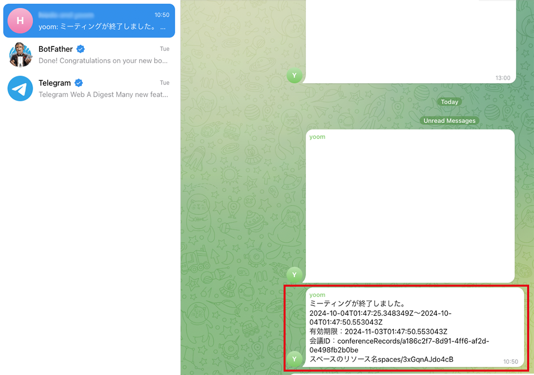 会議が終了すると、会議の日時やID情報がTelegramに自動で通知され、リモートワーカーはその情報を基に会議資料や関連データへスムーズにアクセスできます。特にリモート環境では、会議情報と資料が迅速に共有されることで、すぐに次のアクションに移ることができ、意思決定を加速させます。さらにTelegramのセキュアな環境により、重要な情報を安全にやり取りできるため、安心して業務に取り組めます。