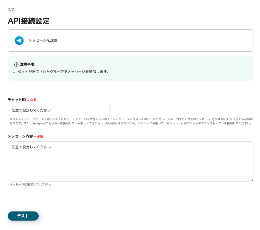 テンプレートの2つ目のプロセスをクリック!Telegramへ自動送信内容を設定します。