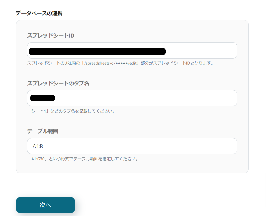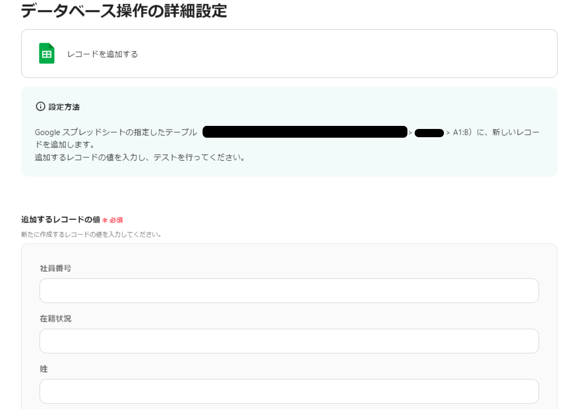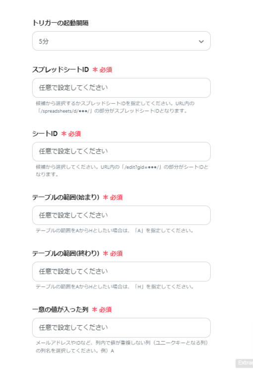 ほかに、対象となるスプレッドシートIDなどの詳細を入力して下さい。
