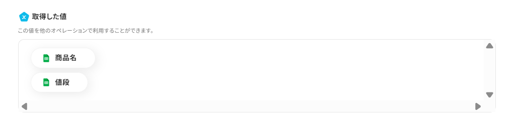 設定後にテストを実行し、成功した場合は、アウトプット(取得した値)を取得できます。実際の設定では、各項目に具体的な値が反映されます。