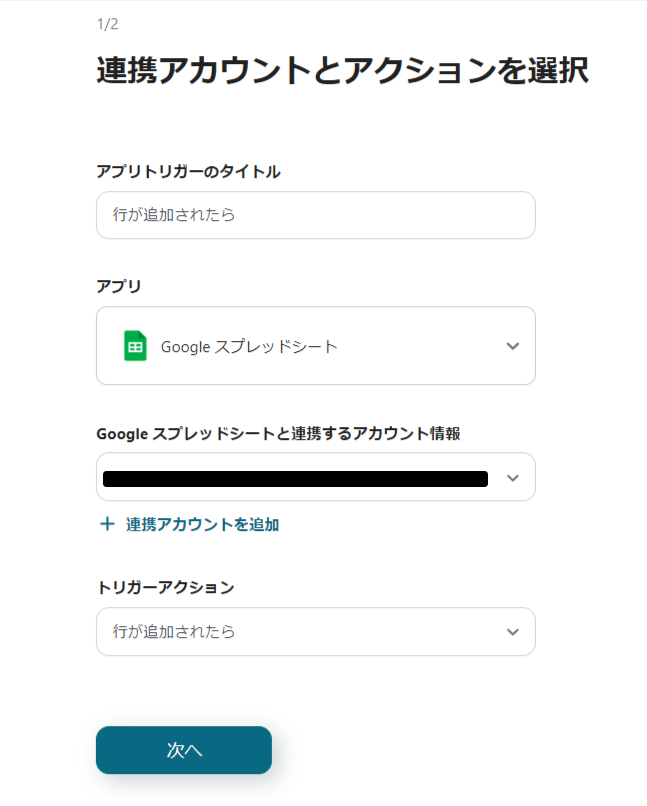 タイトルやトリガーアクションの変更は不要なのでアカウント情報に問題がなければ「次へ」を選択してください。